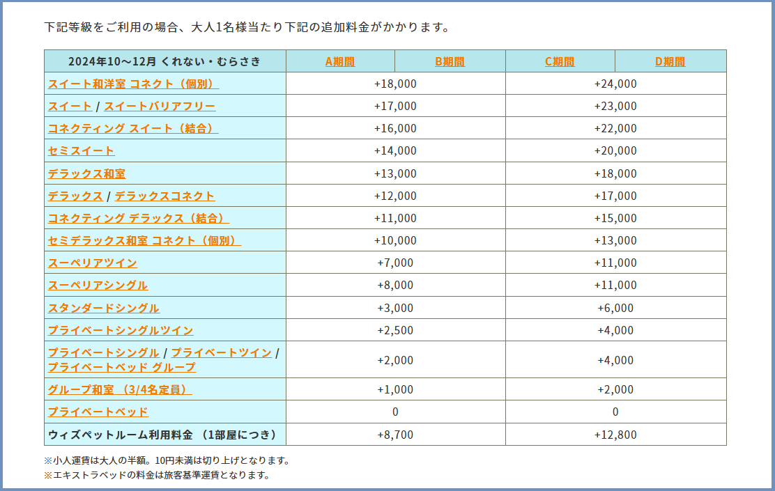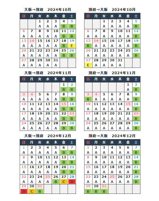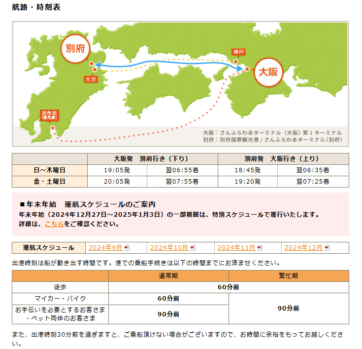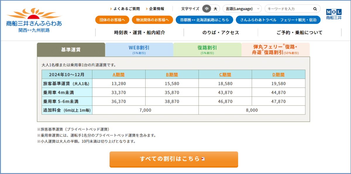 以下は大阪⇔別府航路の2024年10月~12月の運賃です👇