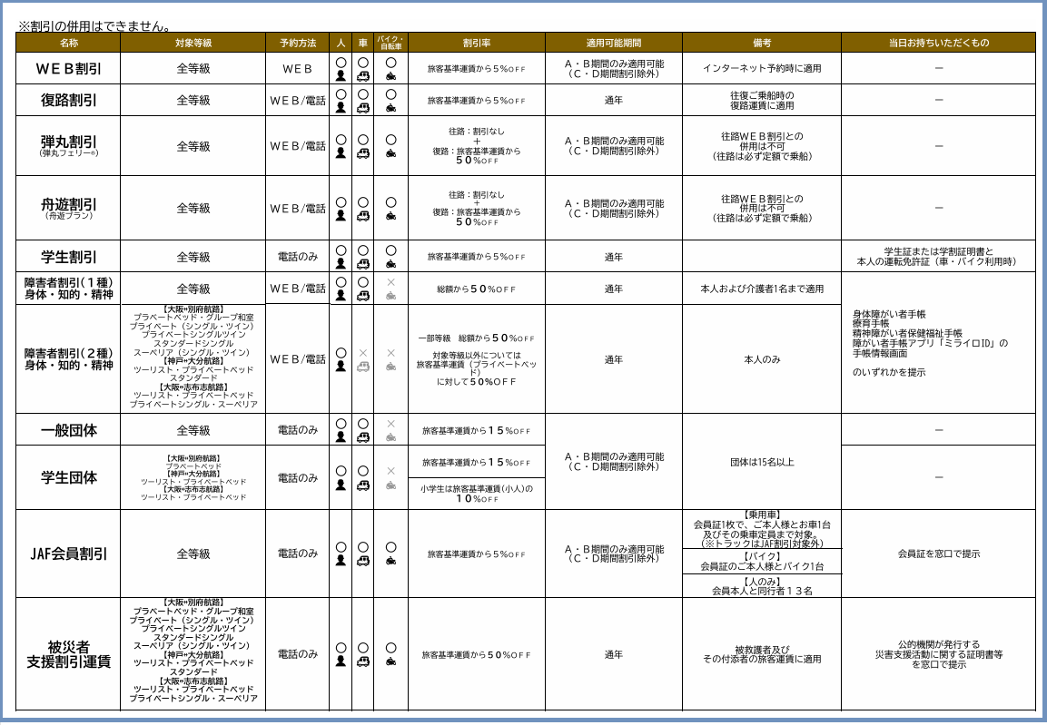 さんふらわあの割引は以下の種類があります👇