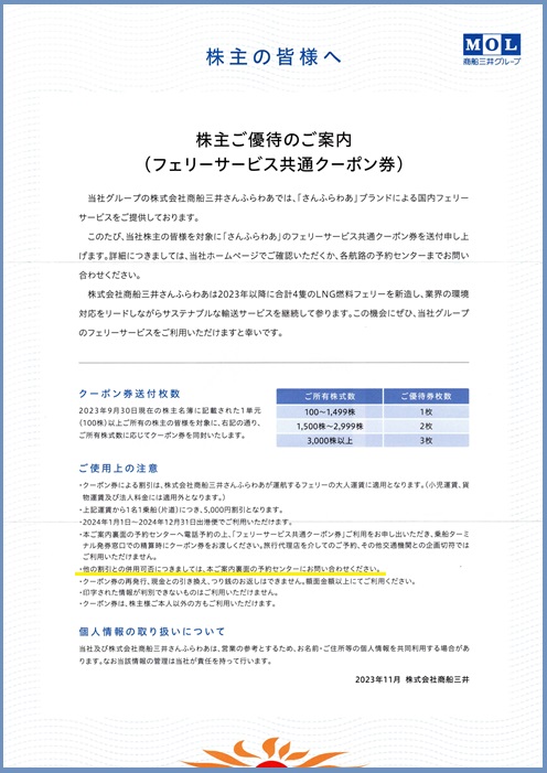 優待内容はにっぽん丸のクルーズ優待券(3月と9月)と、フェリーサービス共通クーポン(9月のみ)です。