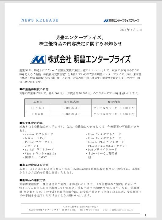 そもそもデジタルギフトとは何かと申しますと、10月権利銘柄の明豊エンタープライズで内容を引用してみました👇