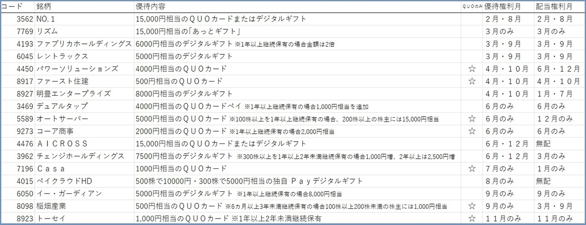 クオカードの現物のみの銘柄は☆マークを付けてみました。