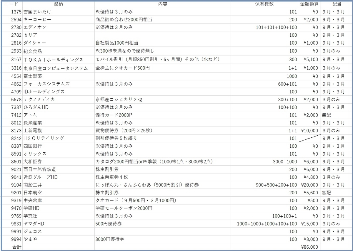 2022年9月銘柄の優待換算金額は86,000円となりました。