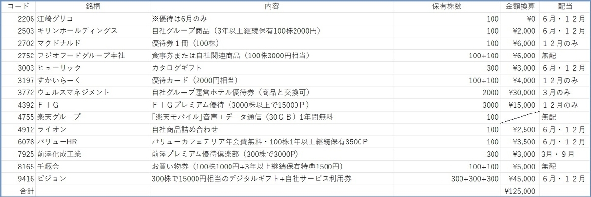 12権利銘柄優待の金額を換算すると、全部で125,000円です。