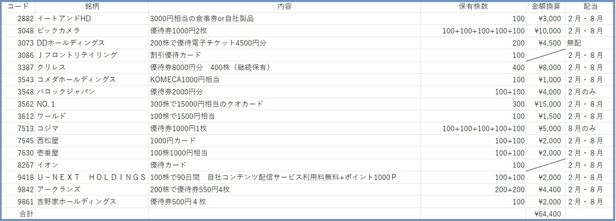 2権利銘柄優待の金額を換算すると、全部で64,400円です。