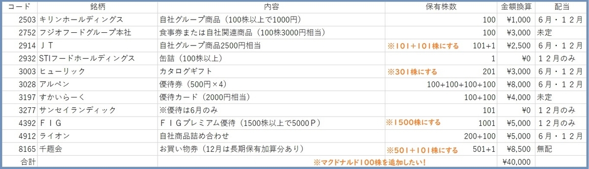 12月権利銘柄優待の金額を換算すると、全部で40000円です。