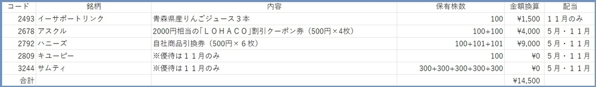 5権利銘柄優待の金額を換算すると、全部で14500円です。