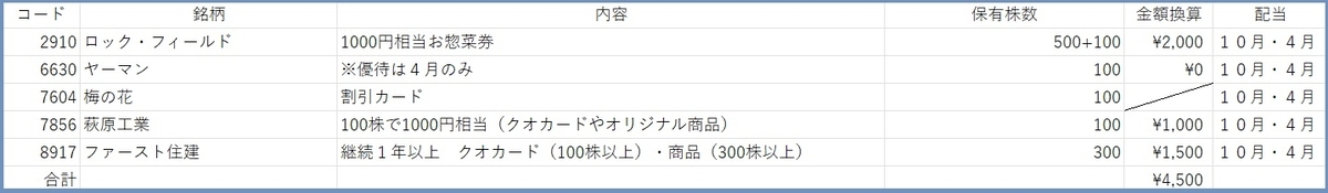 10権利銘柄優待の金額を換算すると、全部で4500円です。