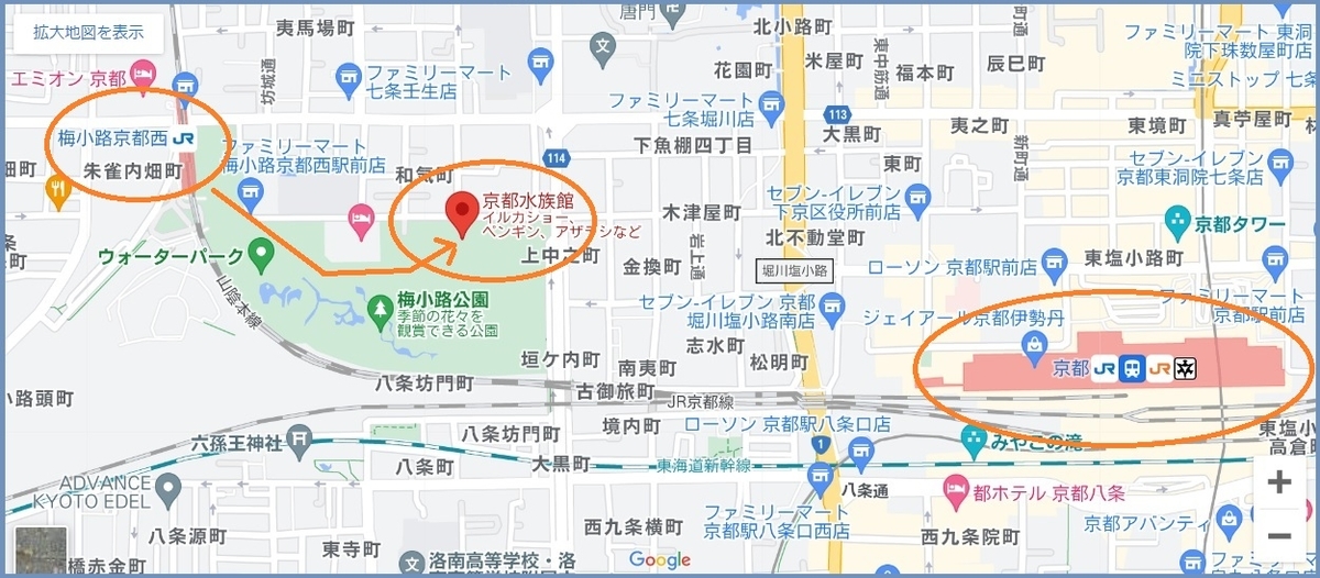 京都水族館の最寄り駅はJR山陰本線「梅小路京都西」駅です。