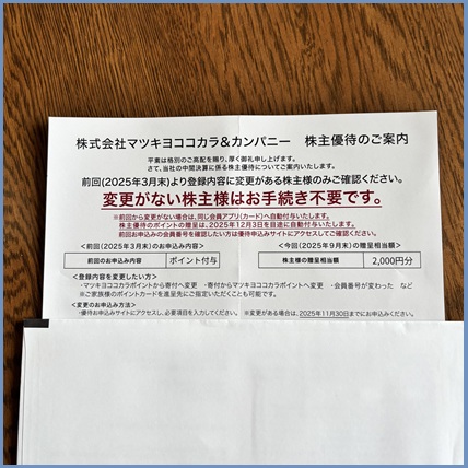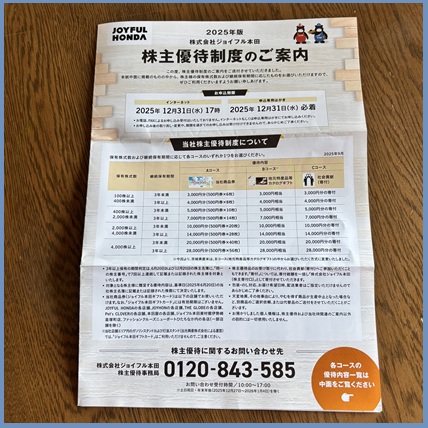 初取得のジョイフル本田の優待案内です。
